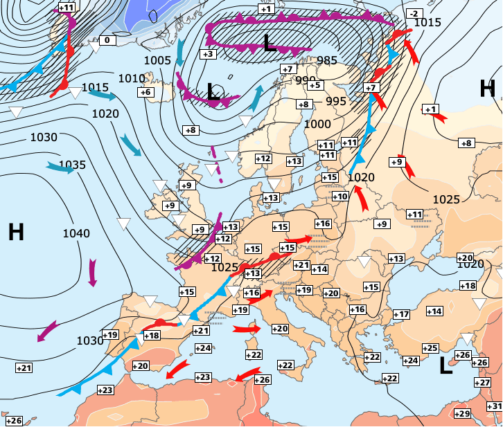 + Comme l'anticyclone des Açores remonte vers les îles britanniques, il va rapidement faire basculer le flux vers une  influence continentale plus froide et plus sèche (d'où un soleil sera souvent généreux entre mercredi et vendredi).