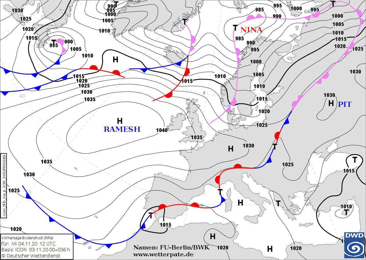 Noms des dépressions et anticyclones prévus pour mercredi 4 novembre 2020 à midi (Berlin)