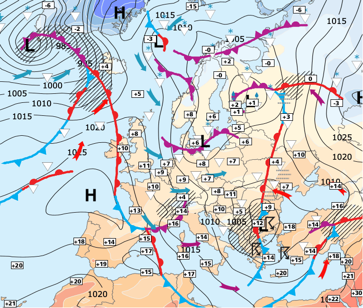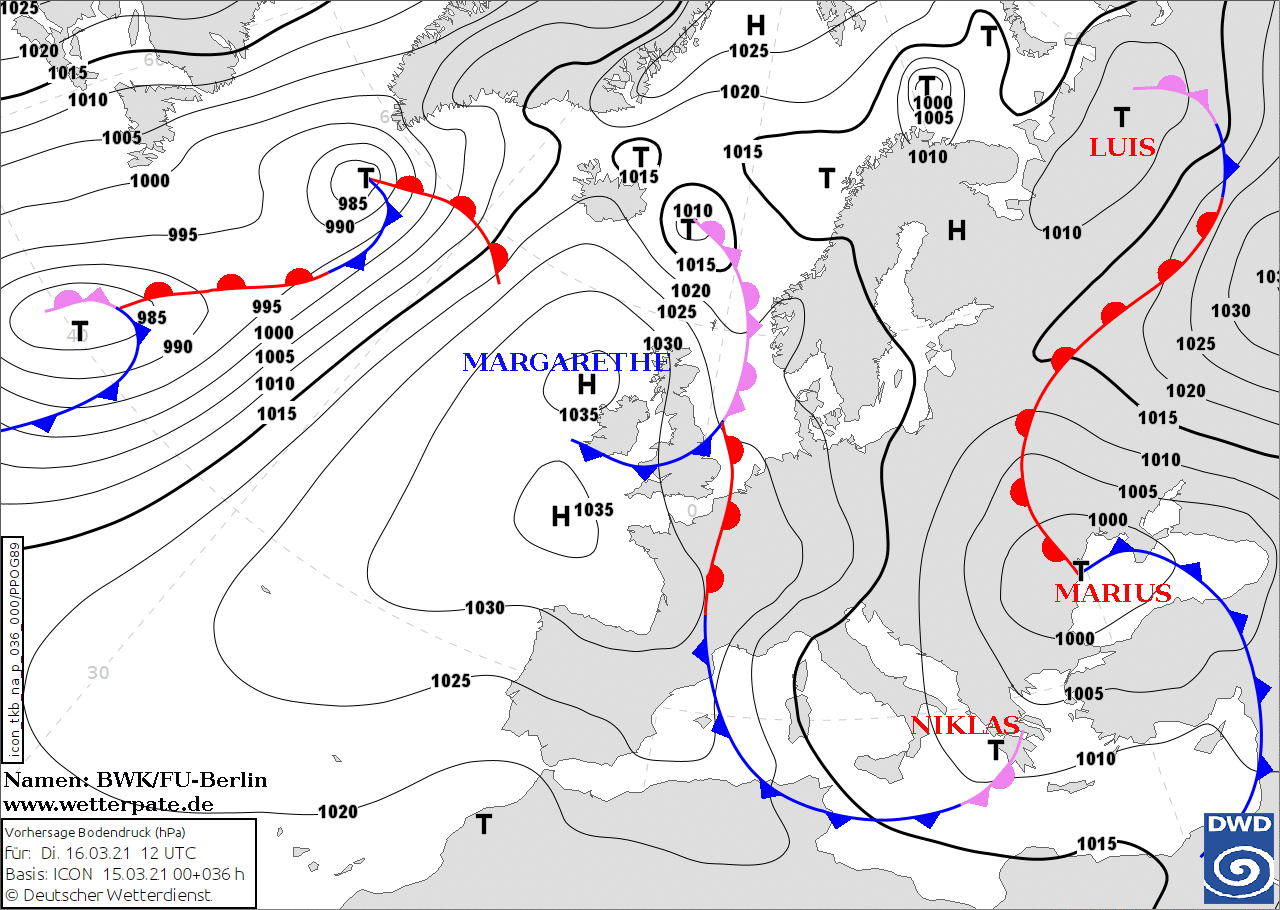Noms des dépressions et anticyclones prévus pour mardi 16 mars 2021 à midi (Berlin)