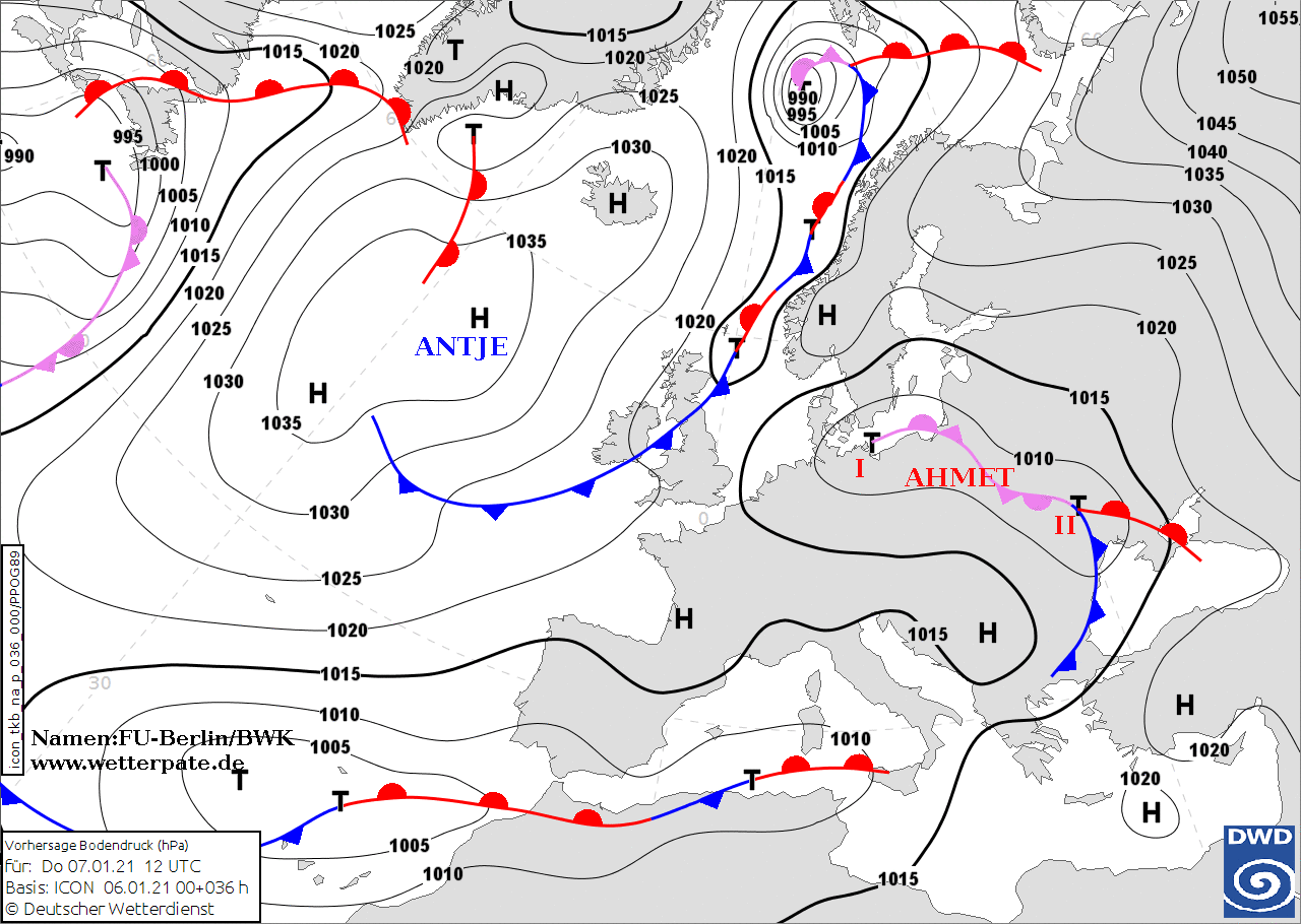 Noms des dépressions et anticyclones prévus pour jeudi 7 janvier 2021 à midi (Berlin)