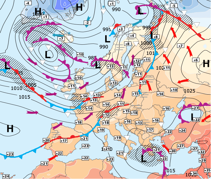 + L’anticyclone subtropical qui recouvre les régions méditerranéennes gonfle peu à peu et va repousser le courant perturbé océanique vers l’Europe du Nord.