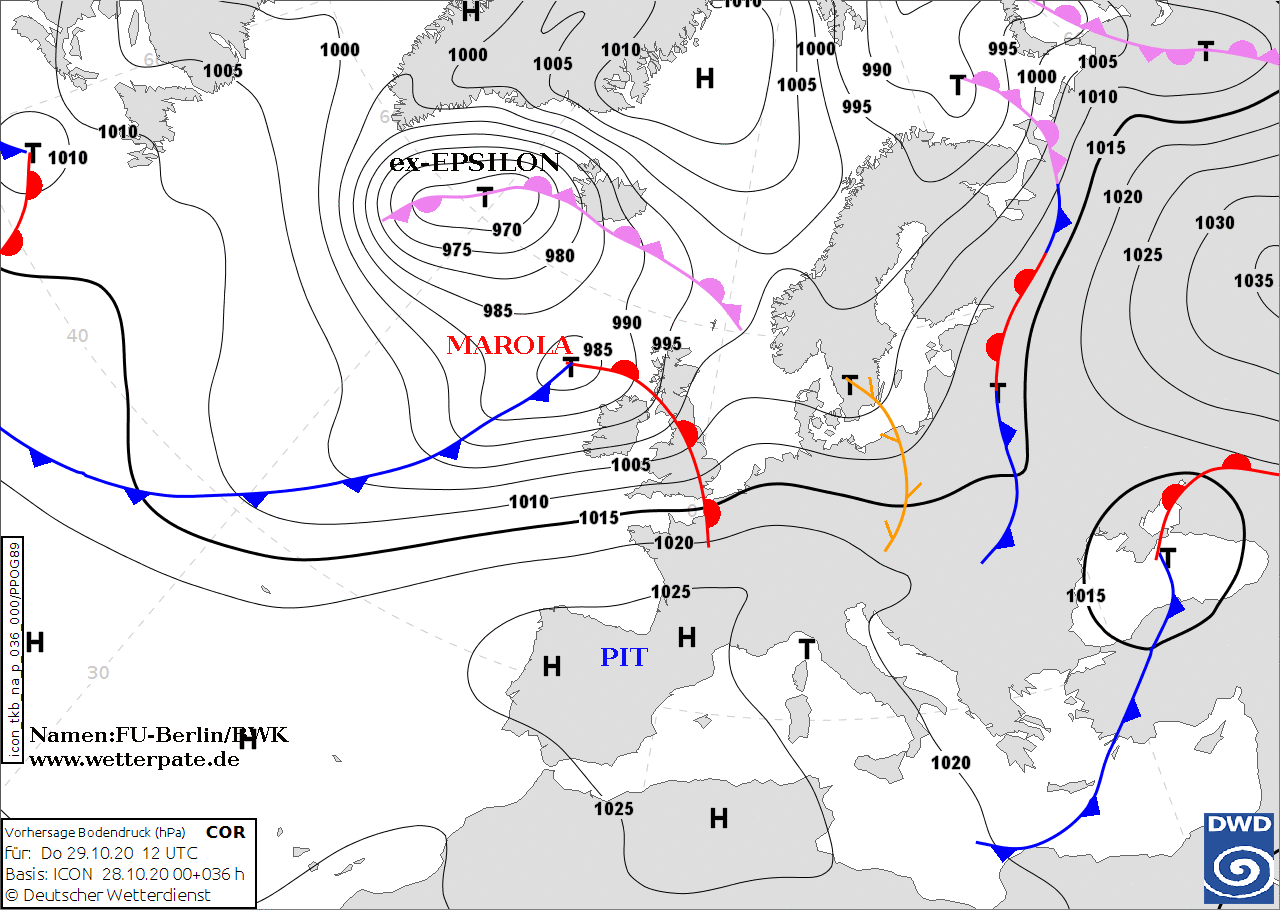 Noms des dépressions et anticyclones prévus pour jeudi 29 octobre 2020 à midi (Berlin)