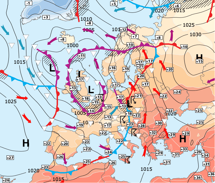 + En revanche, les régions du Nord resteront influencées par un courant perturbé océanique avec de fréquentes précipitations et toujours des températures assez basses pour la saison.