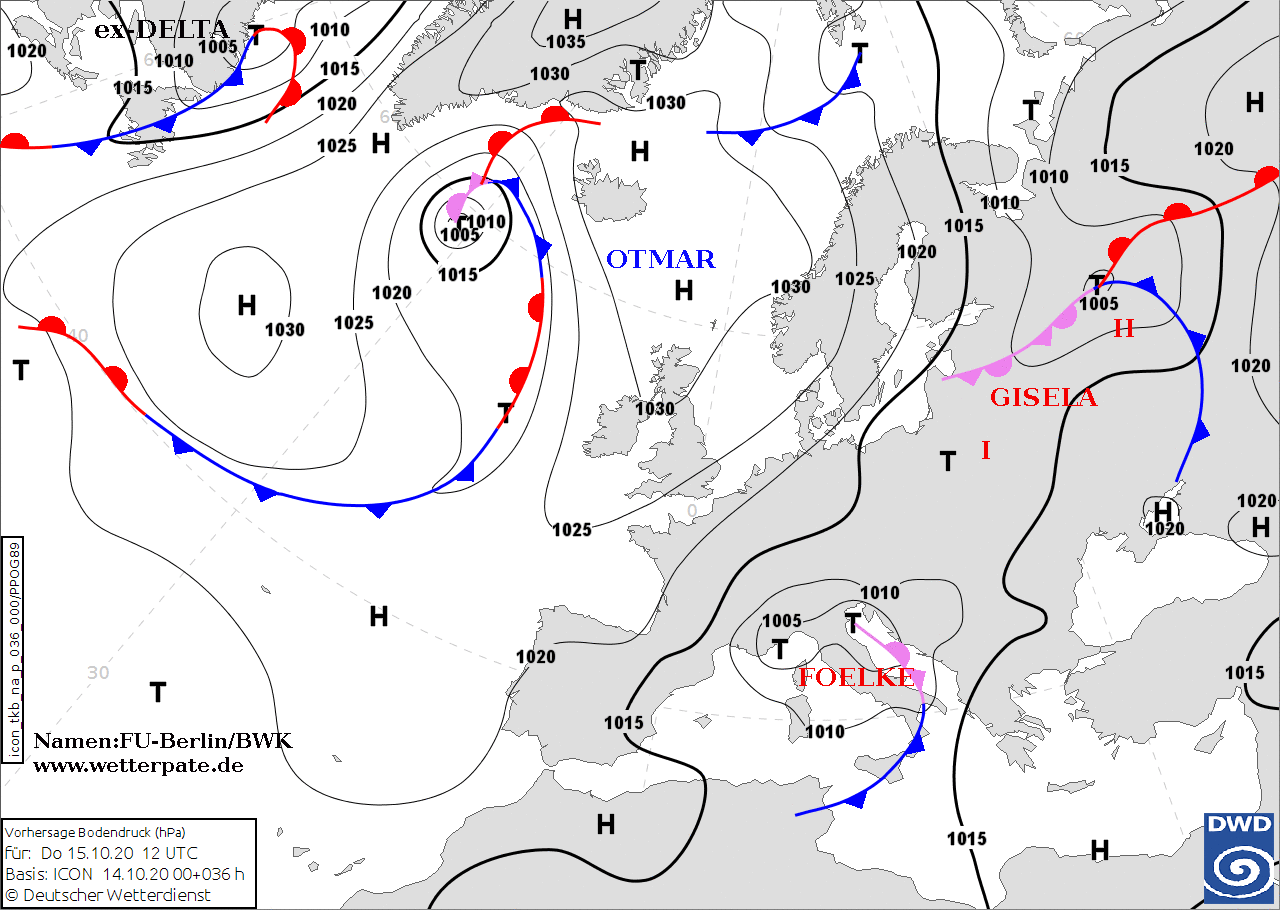 Noms des dépressions et anticyclones prévus pour jeudi 15 octobre 2020 à midi (Berlin)