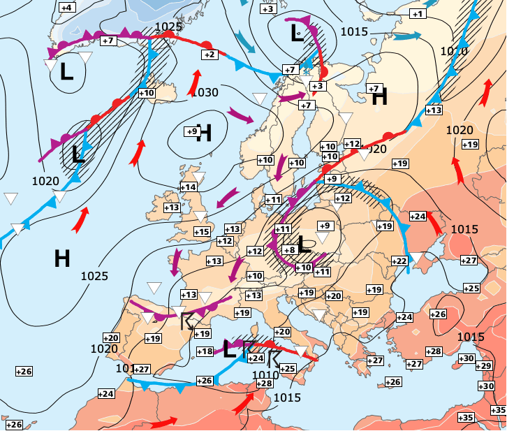+ La goutte froide d’altitude qui est descendue sur la France avec beaucoup d’humidité et d'air frais s'est décalée vers le Sud. L'instabilité y est plus forte sur les régions du Sud-ouest alors que le courant de Nord-est qu'elle engendre est de plus en plus froid avec de la neige jusqu'aux environs de 1100 à 1400 m en montagne.