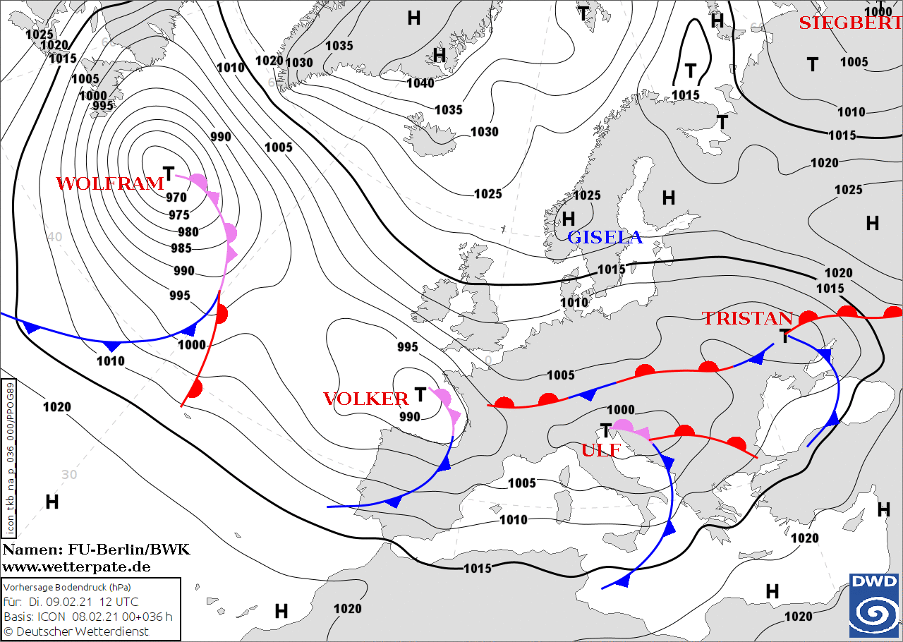 Noms des dépressions et anticyclones prévus pour mardi 9 février 2021 à midi (Berlin)