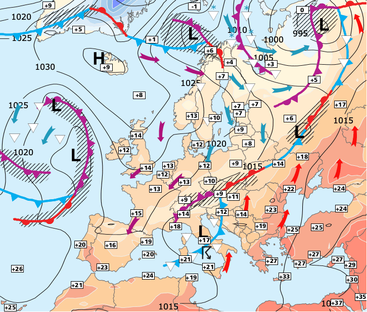 Noms des dépressions et anticyclones prévus pour samedi 17 octobre 2020 à midi (Berlin)