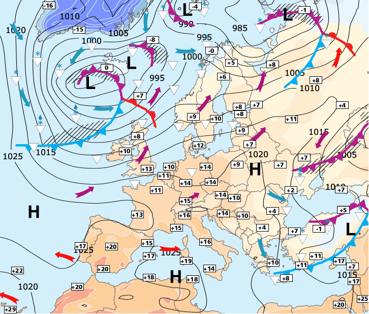 + À l’arrière de ce front, les températures baisseront assez nettement sur la moitié Nord, mais l’anticyclone remontera de nouveau, annonçant un dimanche beaucoup plus agréable.