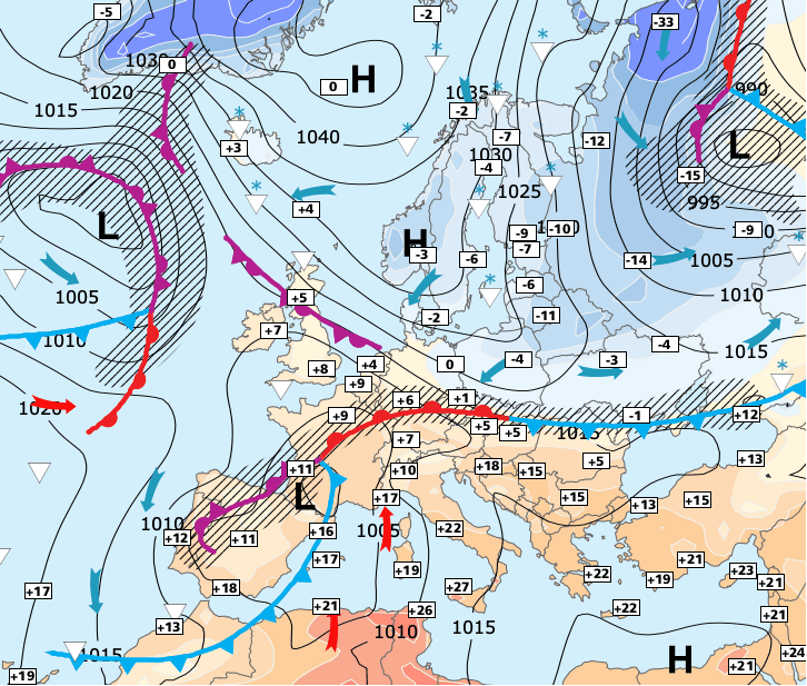 + Un conflit entre remontée chaude méditerranéenne et descente froide de Scandinave est en train de se mettre en place sur la France.