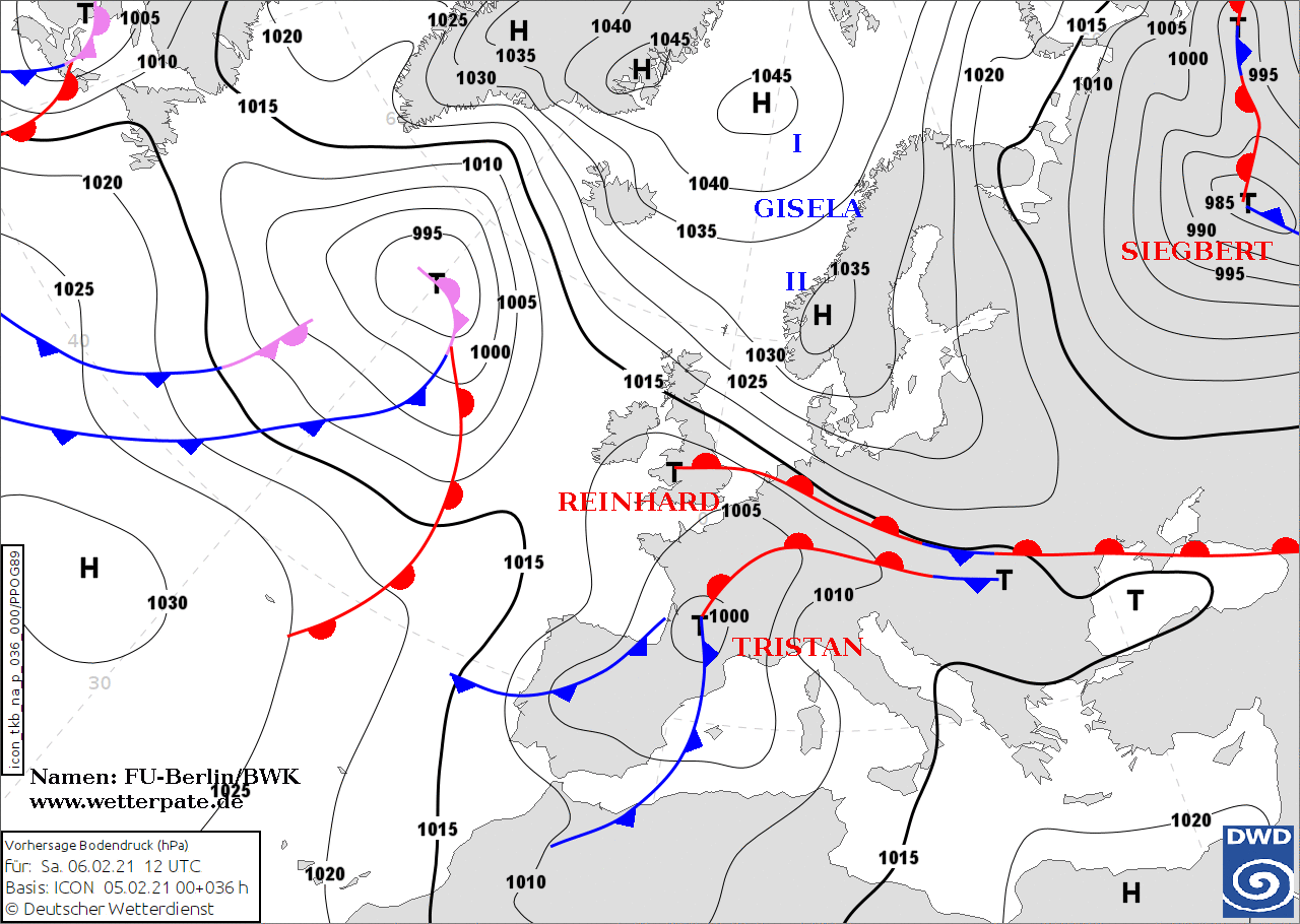 Noms des dépressions et anticyclones prévus pour samedi 6 février 2021 à midi (Berlin)