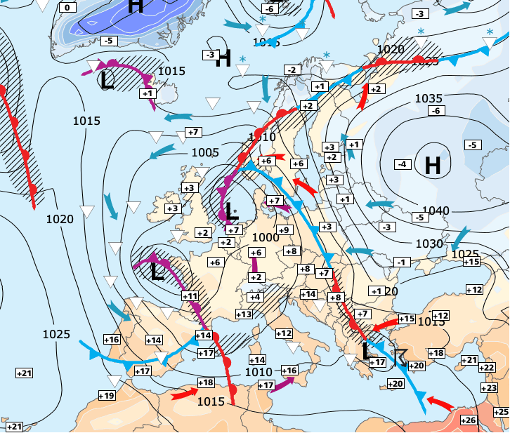 + La descente froide qui affecte toute l’Europe occidentale (et concerne également l’Afrique du Nord avec de la neige en Algérie) ne se décalera que lentement vers l'Est dimanche prochain.