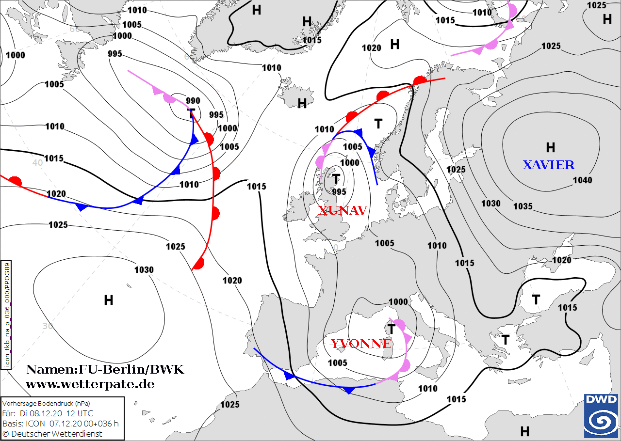 Noms des dépressions et anticyclones prévus pour mardi 8 décembre 2020 à midi (Berlin)