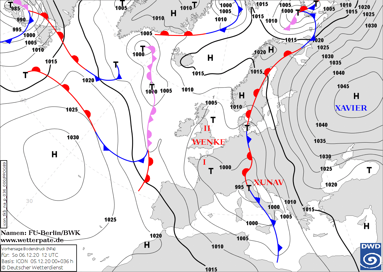 Noms des dépressions et anticyclones prévus pour dimanche 6 décembre 2020 à midi (Berlin)