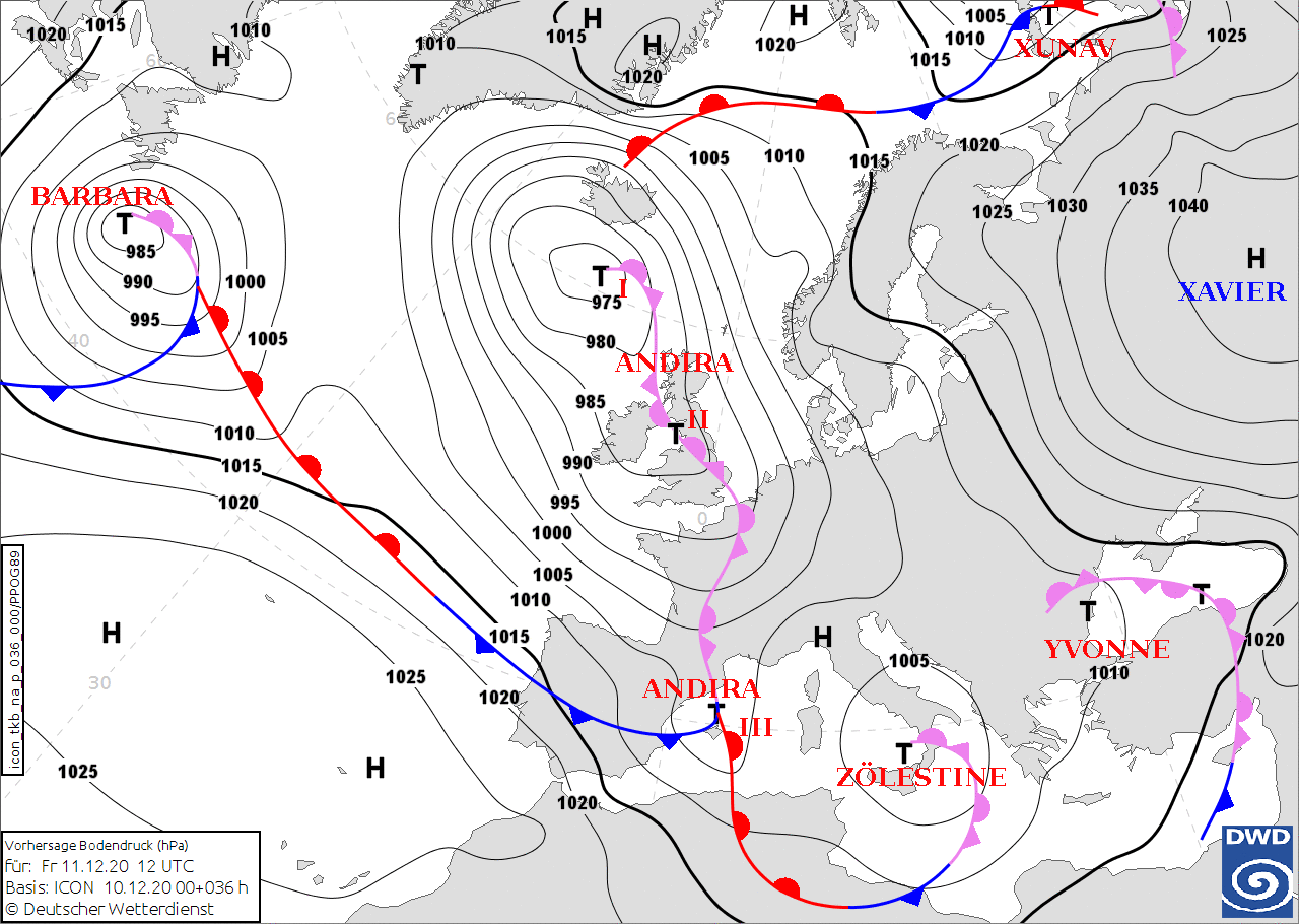 Noms des dépressions et anticyclones prévus pour vendredi 11 décembre 2020 à midi (Berlin)