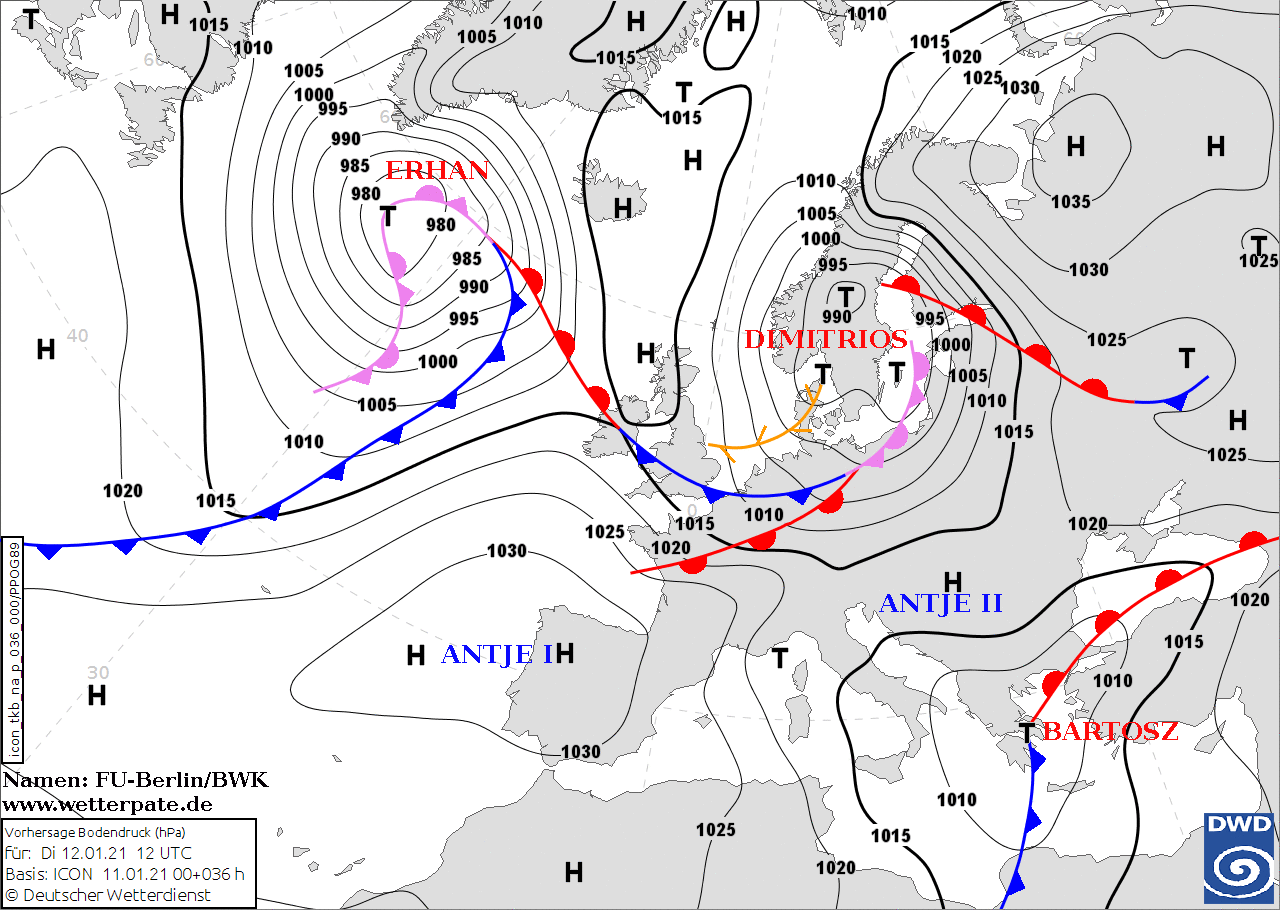 Noms des dépressions et anticyclones prévus pour mardi 12 janvier 2021 à midi (Berlin)