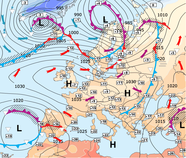 + L'anticyclone qui s'étend sur une bonne partie de l'Europe maintient un temps stable, généralement ensoleillé et frais sur une grande moitié Nord.