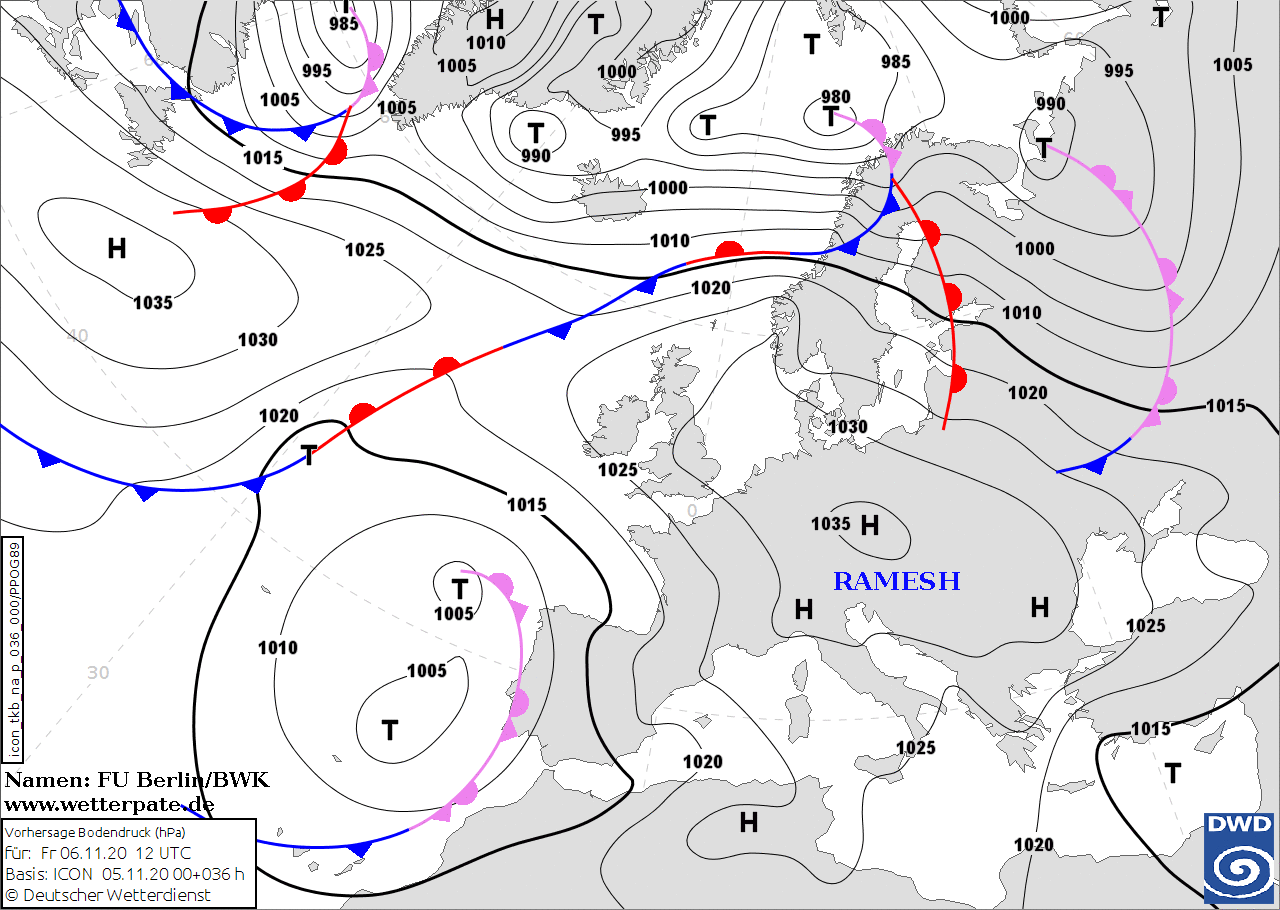 Noms des dépressions et anticyclones prévus pour vendredi 6 novembre 2020 à midi (Berlin)