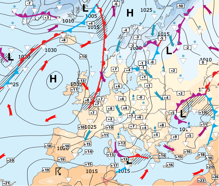 + Ces fronts viendront s'échouer sur nos régions, confrontés aux hautes pressions qui persisteront sur l’Europe continentale.