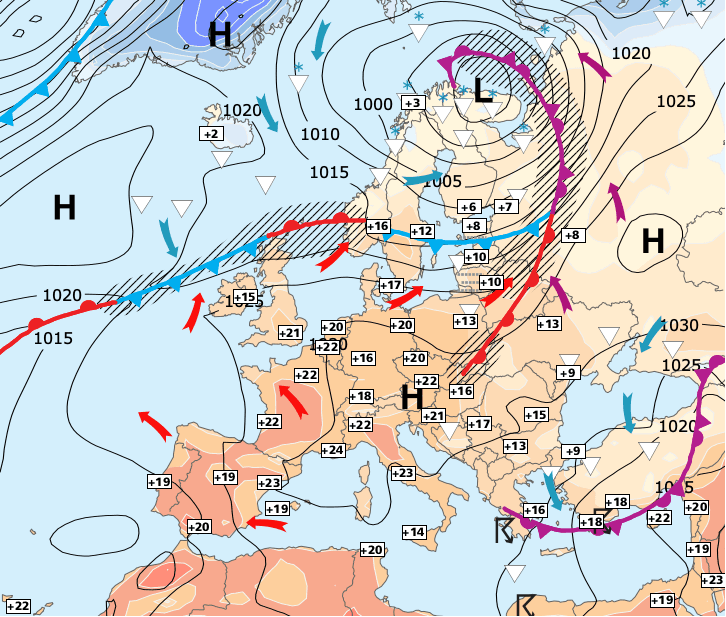 + Mais le vrai changement de temps se produira à partir de lundi, lorsqu’une impressionnante descente d’air polaire maritime en provenance du pôle Nord envahira toute l’Europe occidentale...