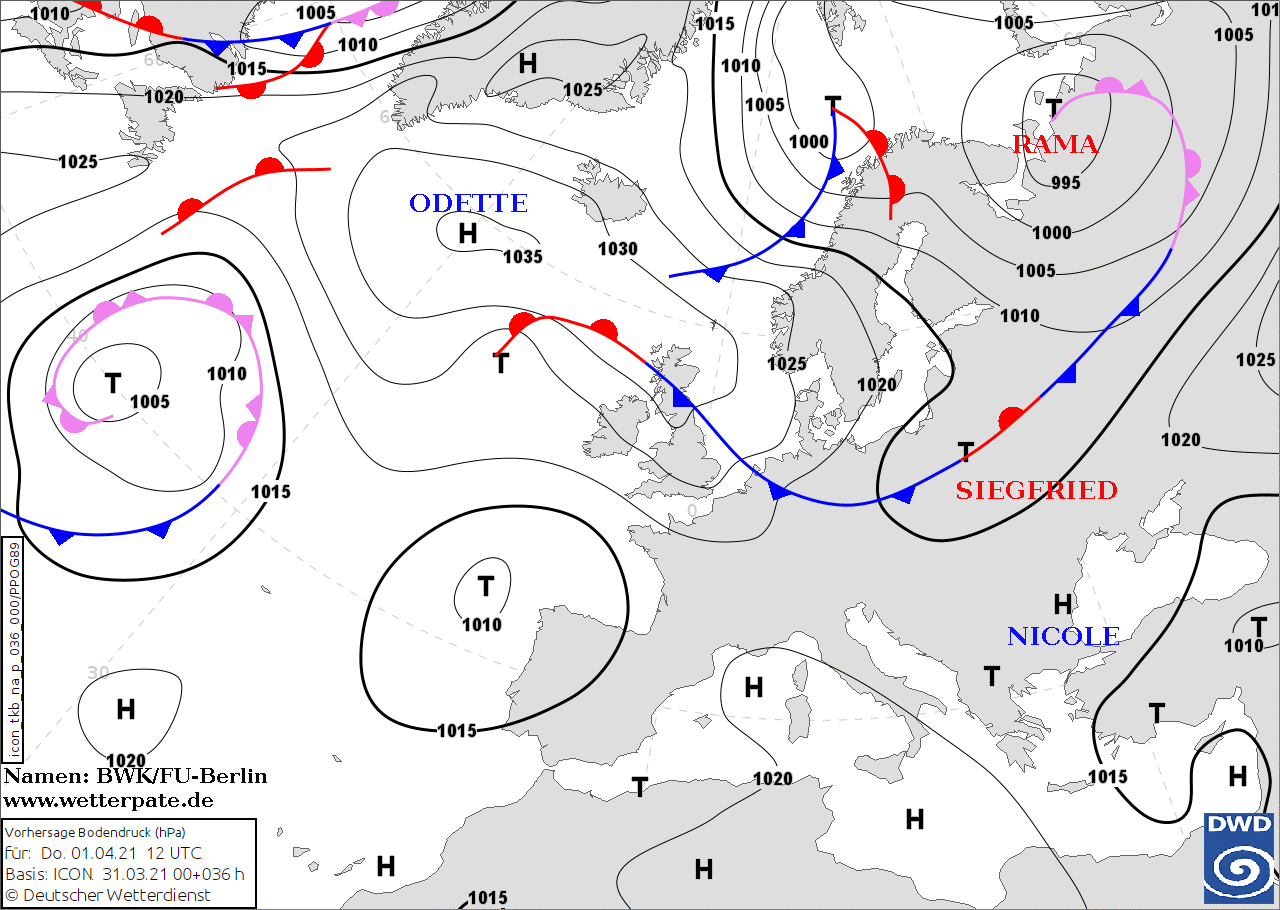Noms des dépressions et anticyclones prévus pour jeudi 1er mai 2021 à midi (Berlin)