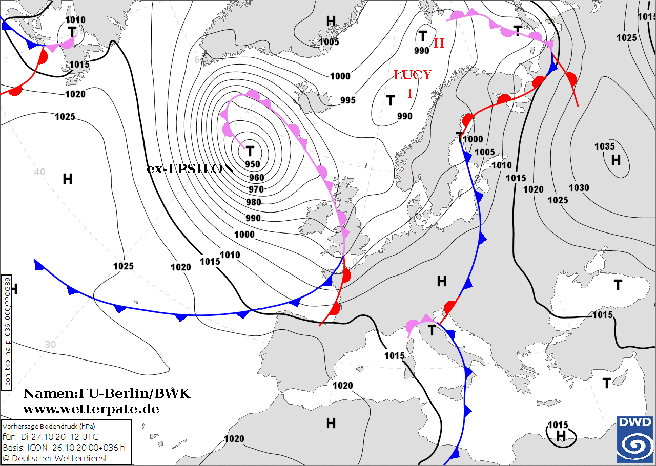 Noms des dépressions et anticyclones prévus pour mardi 27 octobre 2020 à midi (Berlin)